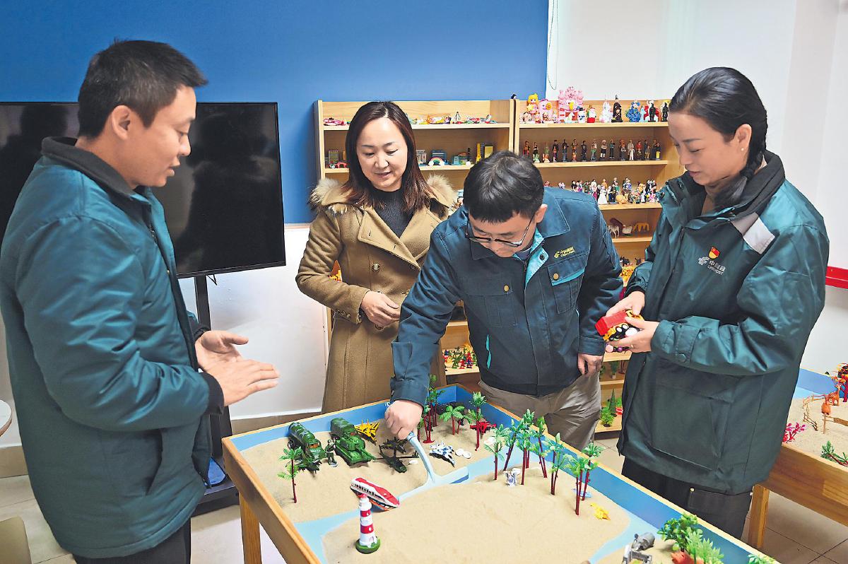 在昆明邮区中心,心理导师向员工介绍“心理沙盘”的使用方法。 □赵焱 摄